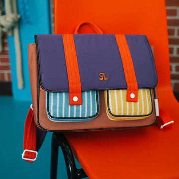 Le cartable est fabriqué à partir de bouteilles en PET recyclé, le rabat en tissu froissé métallisé, possède des bretelles réglables et rembourrées de couleur et les poches en maille rayée tricotée - trop chouette ! À l’intérieur, vous trouverez une poche supplémentaire. Il est doté d’une doublure imperméable et de fermetures éclair YKK de haute qualité. Inscrivez votre nom et vos coordonnées sur l’étiquette fournie avec le sac, pour être sûr qu’il rentre à la maison en cas de perte.